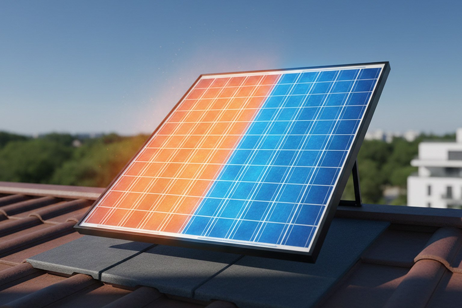 Das Modul bleibt durch die Wärmenutzung kühler – so liefert es mehr Strom als klassische PV, selbst bei hohen Außentemperaturen.